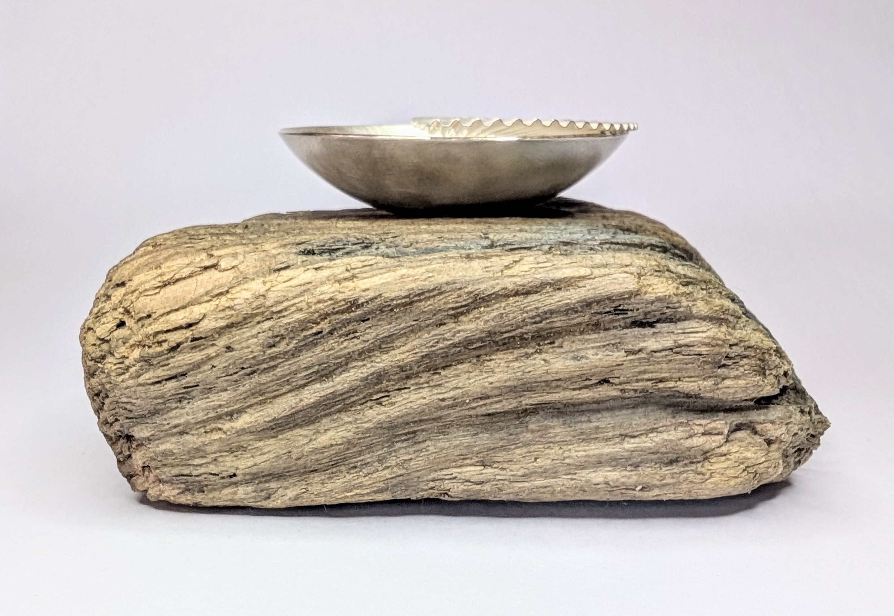 Presented on a sanded and waxed driftwood plinth, this exquisite hallmarked sterling silver bowl, just 70mm in diameter and 17mm high, showcases the pure craftsmanship of a master craftswoman.