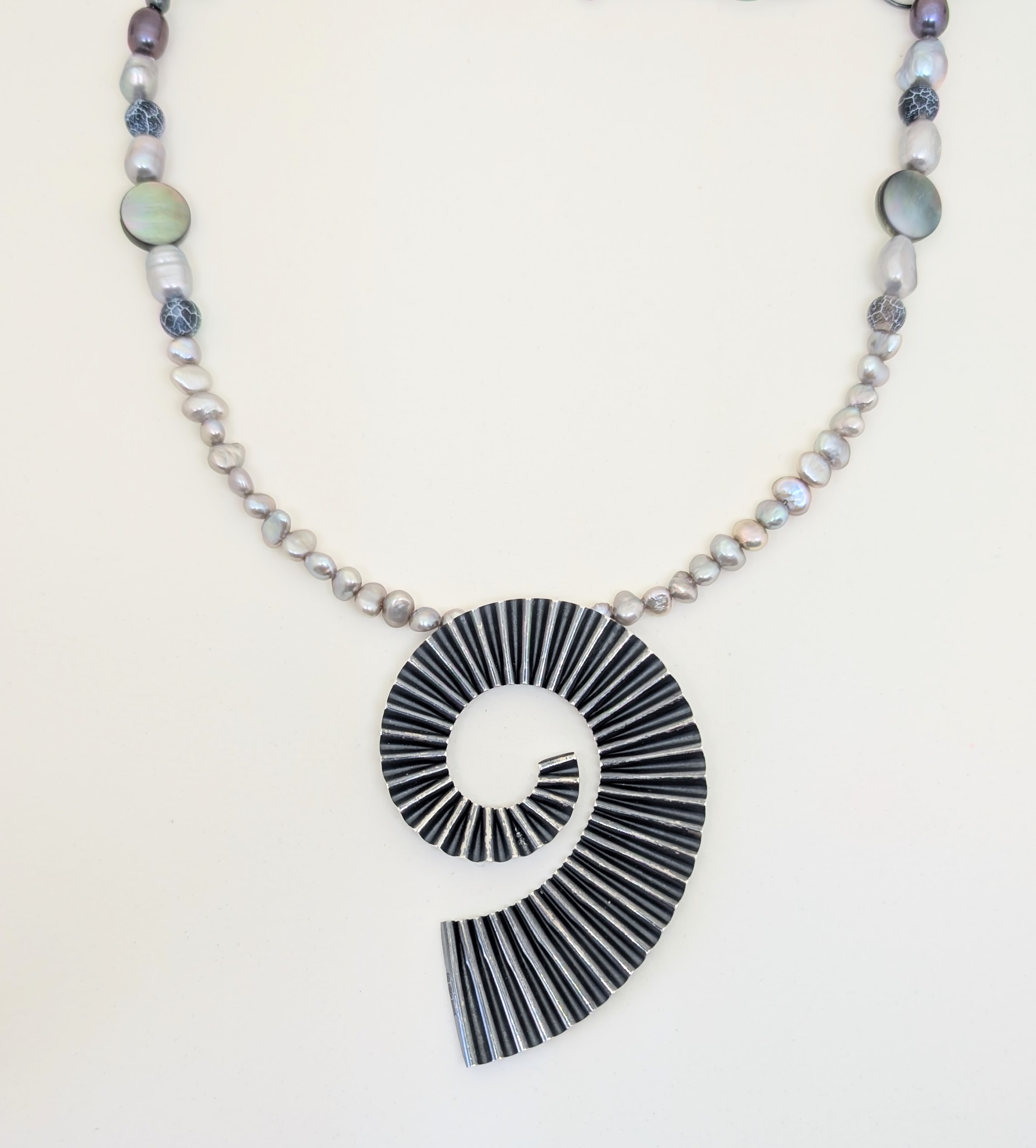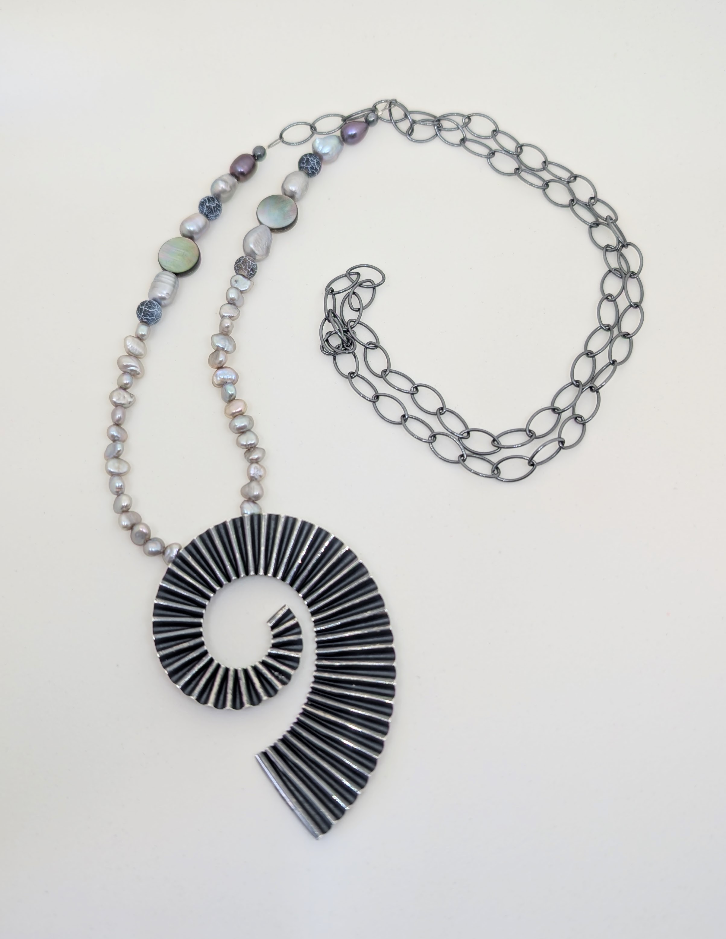 This stunning pendant is complemented with pearls, mother of pearl discs, frosted agate and navette chain.